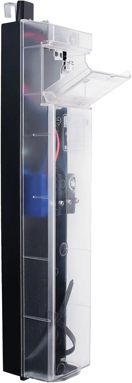 Coffret 80 LES noir, IP44, IK09, 4 modules max, vue de face fermée avec façade transparente.